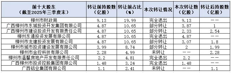 广西柳州市东城投资开发集团有限公司、广西柳州市建设投资开发有限责任公司等4家股东则进行部分转让,转让后仍保留少量股权;另有柳州市金控科技有限公司、广西铝业集团有限公司2家前十大股东未参与本次转让,持股数量保持不变。此外,广西柳州市农业基础设施投资建设集团、柳州市房地产开发有限责任公司、柳北区财政局也分别转让了所持的1.074亿股、0.8亿股和19.99万股。