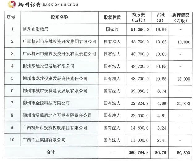 此次股权转让堪称柳州银行股东结构的“全面重塑”。在此之前,柳州市国资委通过下属企业及柳州市财政局合计持有该行92.57%的股份,其中柳州市财政局以19.99%的持股比例为单一最大股东,其他主要股东也多为柳州本地国资平台或关联企业,形成了典型的“市属国资高度集中”格局。