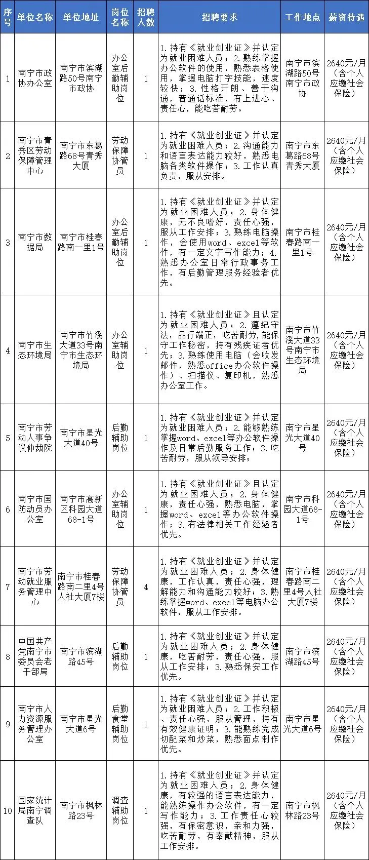 第一步:公开发布招聘岗位信息。人社部门每月向用人单位收集岗位信息并通过南宁市人力资源和社会保障局网站(http://rsj.nanning.gov.cn/)、南宁人社微信公众号等方式向社会公开发布公益性岗位信息及专场招聘会时间;