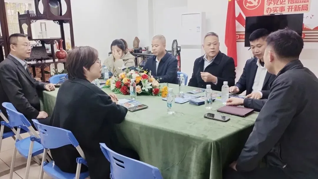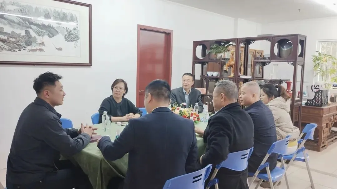 参观结束后,双方在会议室开展座谈交流。现场氛围热烈,桌上摆放着交流资料与鲜花,与会人员围绕职业教育与社会培训衔接、校企资源整合、特色实训体系搭建等内容深入探讨。