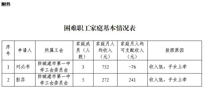 根据《防城港市总工会关于开展防城港市困难职工精准识别建档立卡和信息核对工作的通知》(防工字〔2022〕15号)有关规定,经审核,防城港市第一中学工会委员会申报的2户困难职工家庭符合建档条件,按照建档程序,现予以公示。公示期为2026年1月7日至1月13日,公示时间为5个工作日。如有异议,请在2026年1月13日前以书面形式向防城港市总工会困难职工帮扶中心反映。