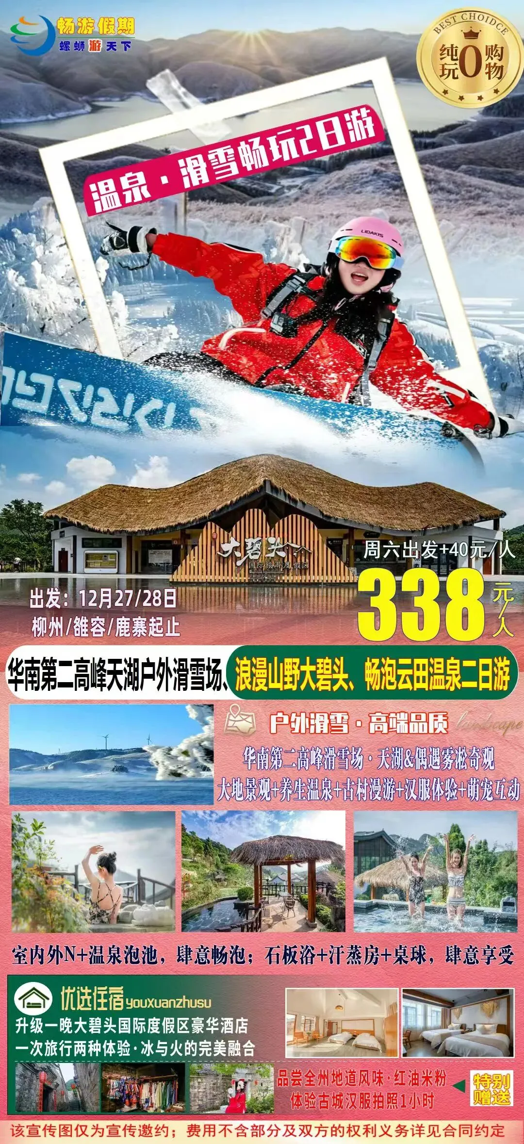 12月27日(已经成团,有位)畅享滑雪·云田间泡温泉】天湖户外滑雪场、大碧头云田养生温泉纯玩二日游338元/人(不含滑雪门票)
