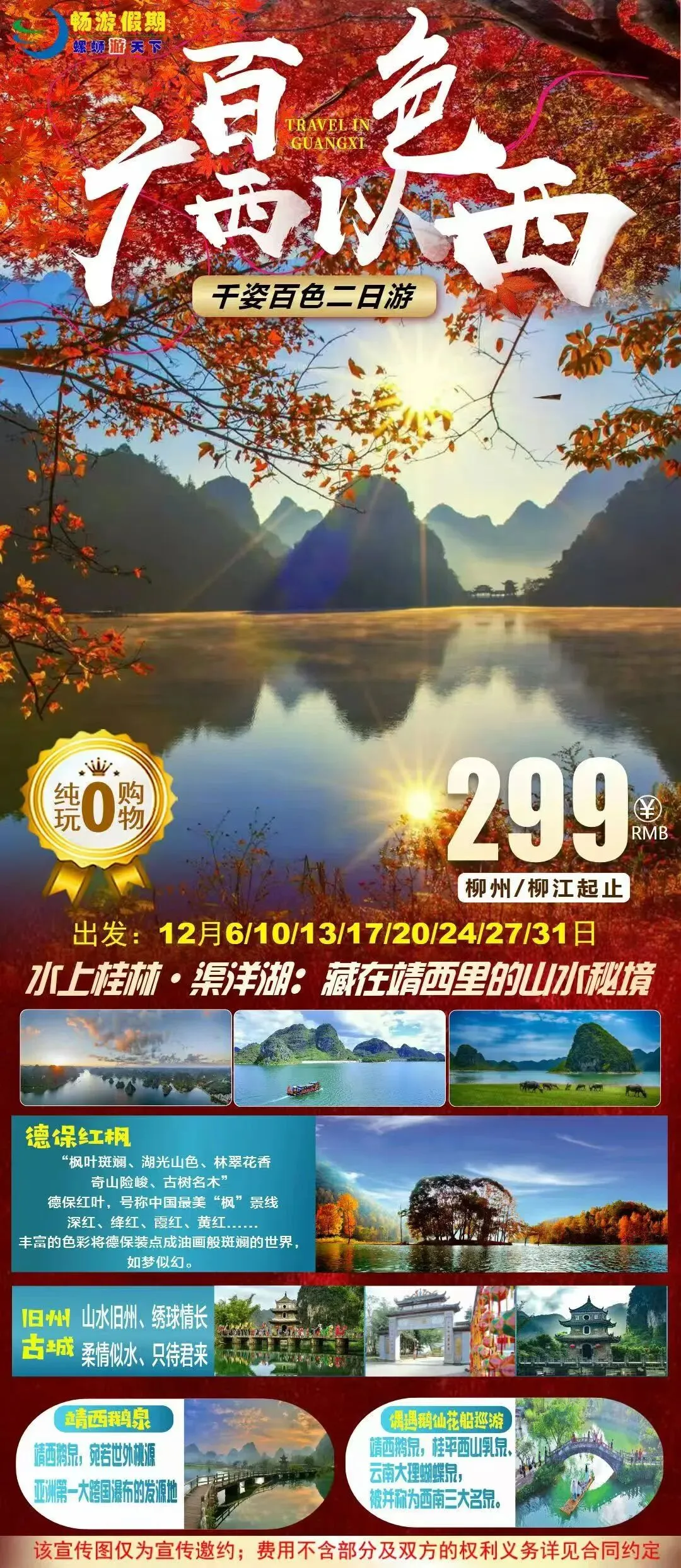 请关注柳州游山玩公众号,每天都更新活动!以下活动都是纯玩,纯玩,不进任何购物店!报名交费后活动不成团退全款,客人出发前临时有事不能参加活动不退款!报名活动加微信,没有紧急事请勿打电话!
