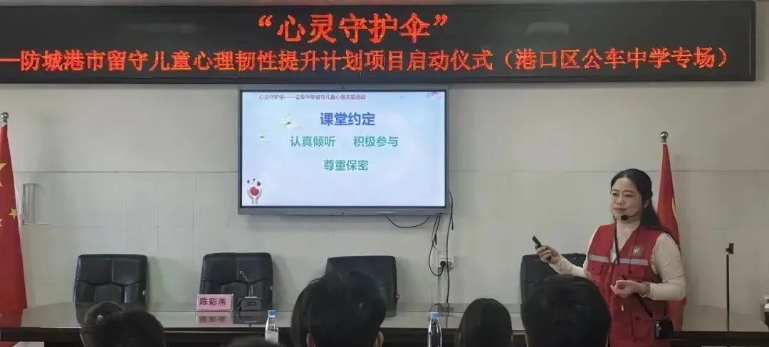 2025年12月8日上午,防城港市心理卫生协会在港口区公车中学举办了“心灵保护伞——防城港市留守儿童心理韧性提升计划”项目启动仪式。会长夏春梅介绍了项目背景及实施计划,表示儿童心理韧性不是天生特质,而是可以通过后天培养的能力,希望通过多方支持努力,建立起一套可复制、可推广的留守儿童心理支持模式。