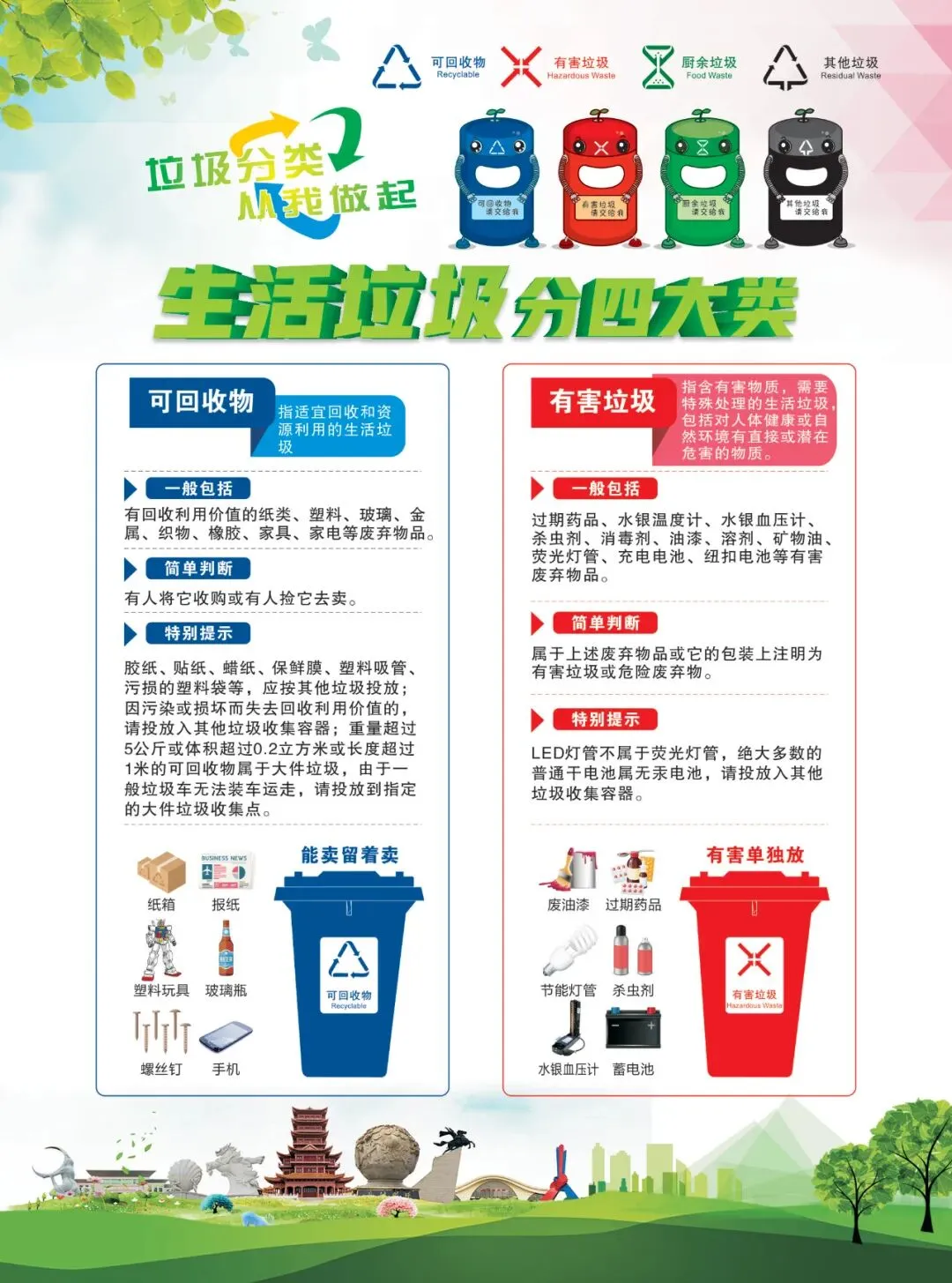 自觉践行垃圾分类。严格遵守垃圾分类相关政策法规,进行垃圾源头减量,减少或不使用一次性用品,自觉按可回收物、厨余垃圾、有害垃圾、其它垃圾“四分类”投放,建立简约适度、绿色低碳、文明健康的生活方式。
