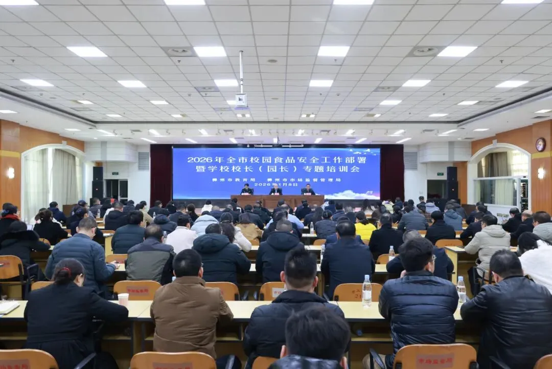 按照党中央、国务院决策部署和中央纪委国家监委关于开展校园餐治理的工作要求,进一步压紧压实学校主体责任,持续提升校园食品安全治理能力和保障水平,1月8日,柳州市市场监管局、市教育局联合召开2026年全市校园食品安全工作部署暨学校校长(园长)专题培训会,深入分析当前柳州校园食品安全工作面临的风险挑战,部署2026年重点任务。柳州市、县(区)两级教育、市场监管部门相关负责人,各级各类学校(幼儿园)校(园)长、食品安全总监(安全员),驻市高校,以及校外供餐企业、大中型食材配送企业主要负责人共计1500余人参加线上线下会议。