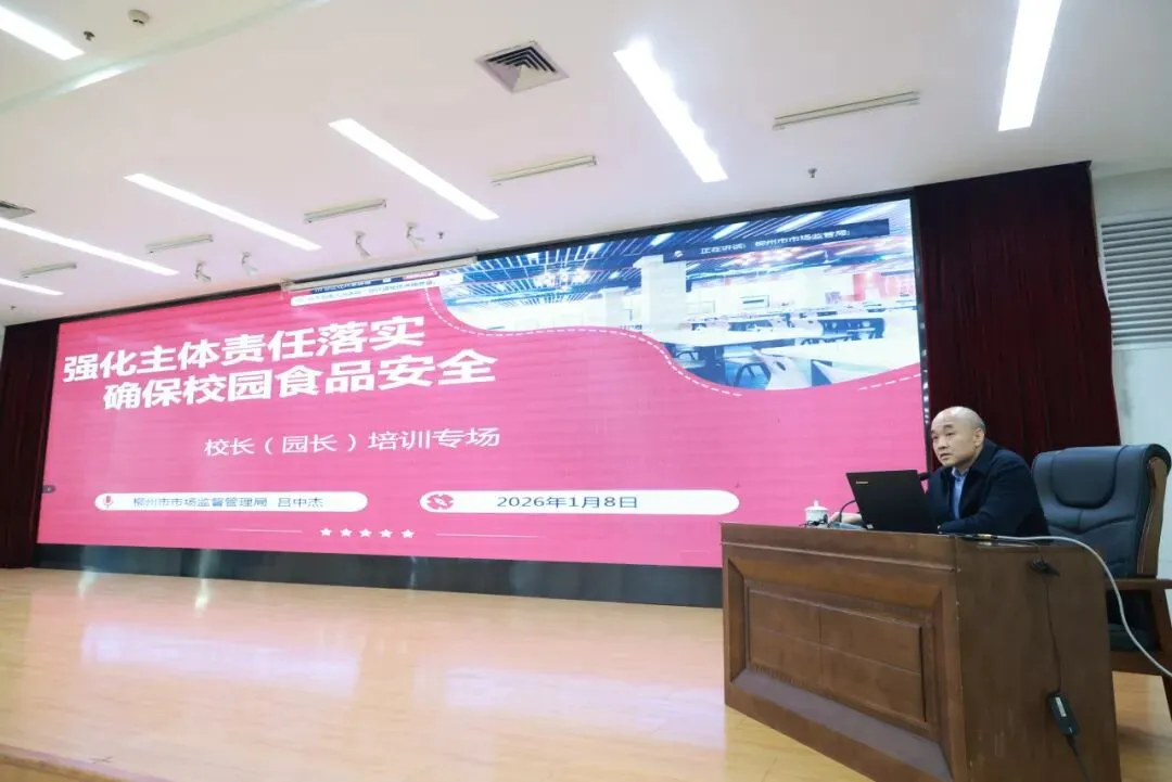 为切实破解“主体责任虚化、制度执行流于形式”等突出问题,柳州市市场监管局以“强化主体责任落实,确保校园食品安全”为主题,为全体校(园)长讲授了一堂系统深入的“必修课”。内容全面覆盖思想认识、法规形势、主体责任内涵、落实路径、食堂与供餐管理、应急处置、风险预防及长效保障等八大核心模块。通过专业政策解读、典型案例剖析和实操方法指导,系统解答了“为何管、管什么、怎么管”的根本问题,提供了一套“看得懂、记得住、用得上”的工作指南,从而切实提升其作为食品安全第一责任人的政治自觉与业务本领。