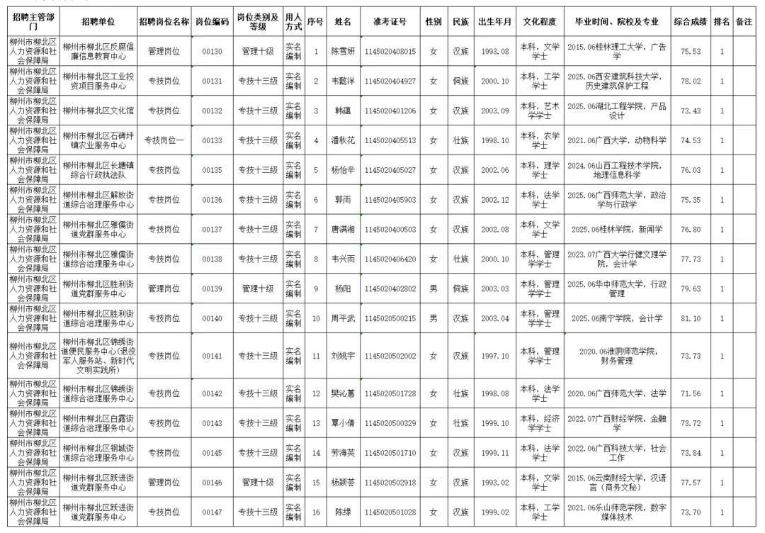 柳北区2025年度下半年事业单位公开考试招聘工作人员拟聘用人选公示(第一批)