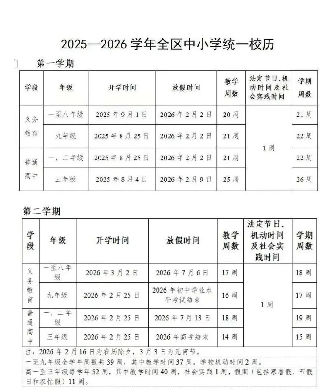 《2025—2026学年普通中小学校教学日历》同时明确了2026年春季学期开学时间、放假时间、教学周数等内容。根据安排,一至八年级学生将于3月2日开学,7月6日放暑假,教学周数为17周。九年级和高一、高二、高三年级学生均于2月25日开学,但放假时间、教学周数不同。其中,九年级学生放假时间为2026年初中学业水平考试结束,教学周数为16周;高一、高二年级学生放假时间为7月13日,教学周数为18周;高三年级学生放假时间为2026年高考结束,教学周数为14周。