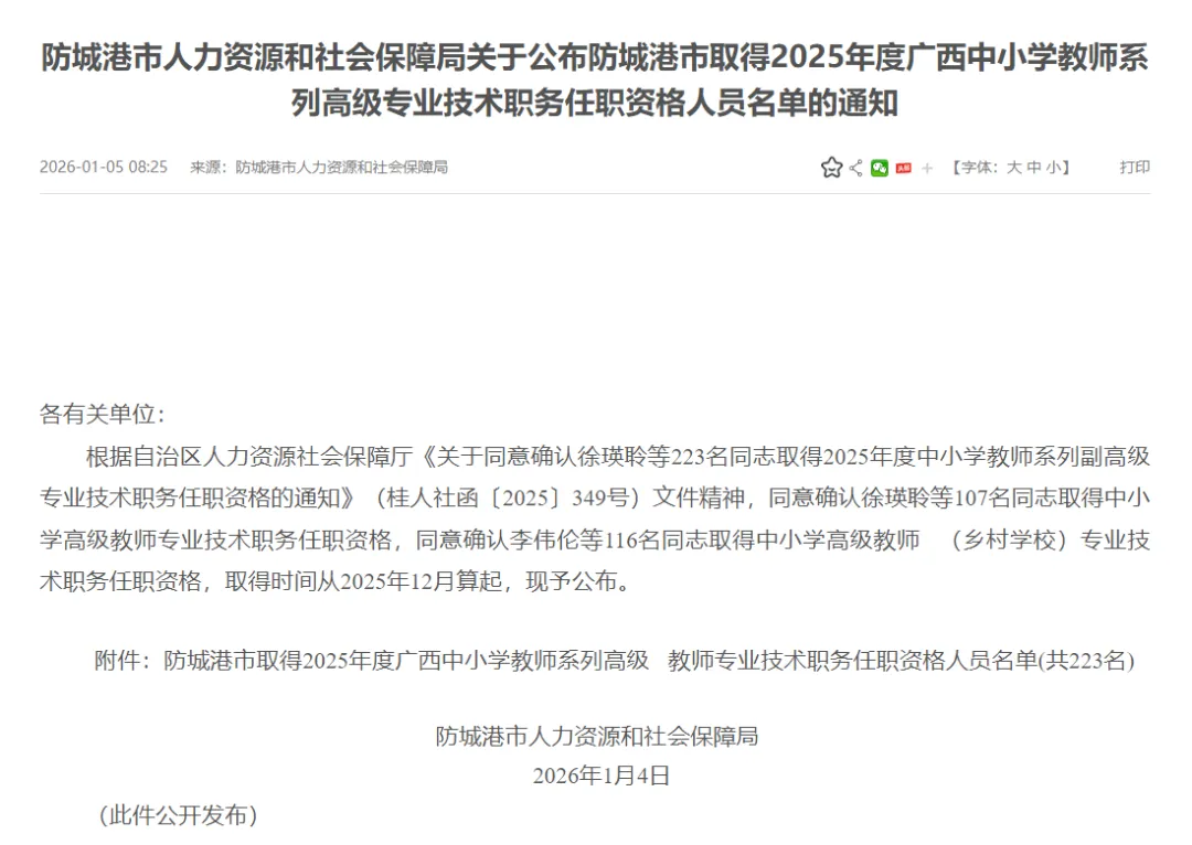 根据自治区人力资源社会保障厅《关于同意确认徐瑛聆等223名同志取得2025年度中小学教师系列副高级专业技术职务任职资格的通知》(桂人社函〔2025〕349号)文件精神,同意确认徐瑛聆等107名同志取得中小学高级教师专业技术职务任职资格,同意确认李伟伦等116名同志取得中小学高级教师 (乡村学校)专业技术职务任职资格,取得时间从2025年12月算起,现予公布。