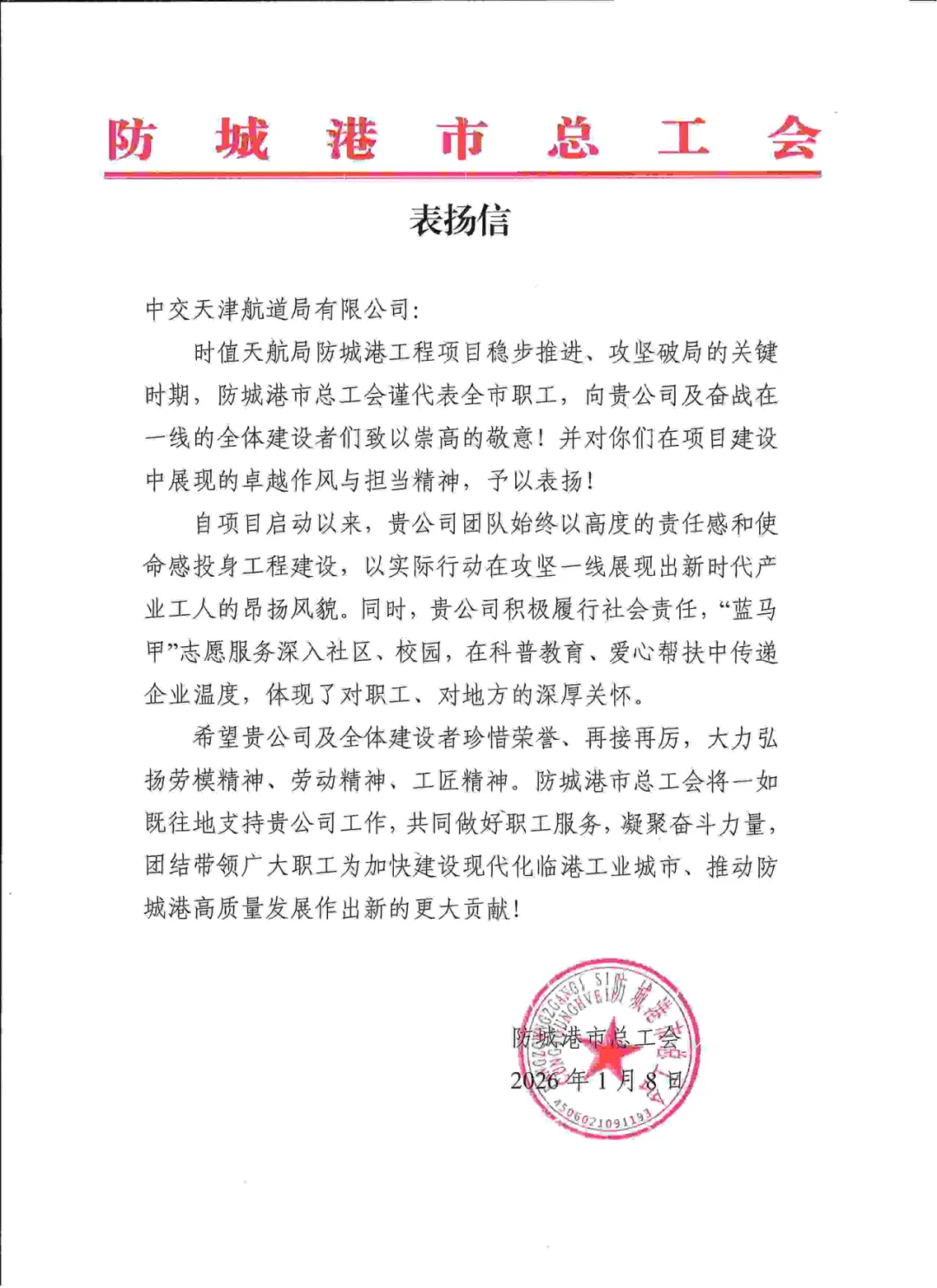 1月8日,防城港工程项目部收到防城港市总工会发来的表扬信。信中对项目部在防城港港30万吨级进港航道工程(一期)施工Ⅲ标建设过程中展现出的卓越作风与担当精神给予高度肯定和赞扬,为全体参建人员注入了强劲的奋进动力。