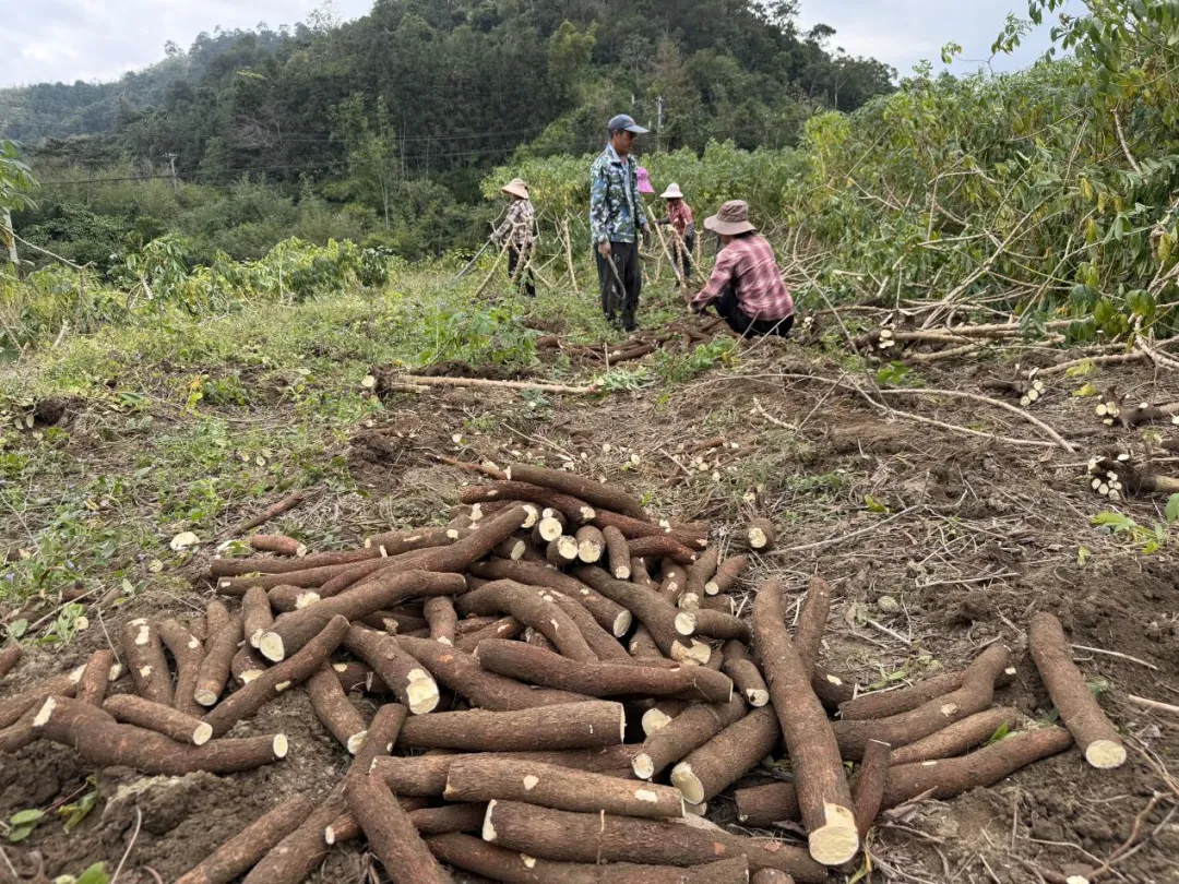 眼下正值黄心木薯的丰收加工旺季,在防城区那良镇400亩黄心木薯基地里,农户们忙着采挖、装车,饱满的木薯不断从田间运出。