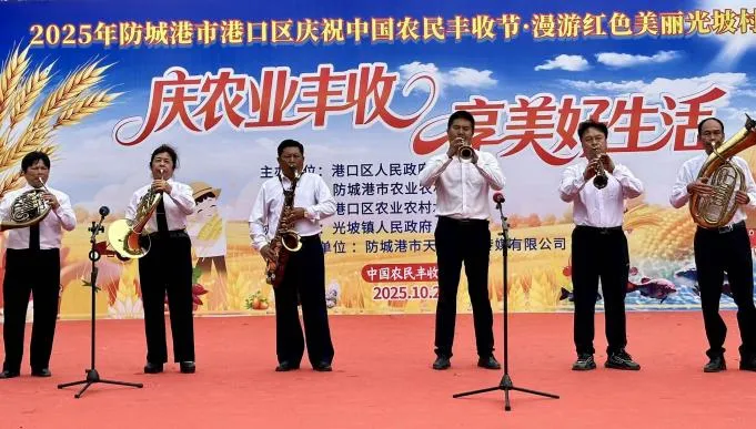 产业发展与文化传承相得益彰,港口区光坡镇光坡村将中国农民丰收节与红色文化深度融合,以“文艺展演+互动体验+美食品鉴”的多元形式,让丰收庆典充满乡土气息与红色底蕴,为乡村振兴注入精神力量。