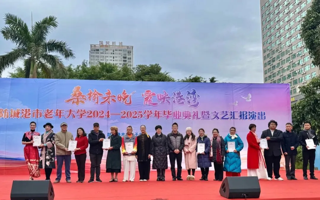 2026年1月6日,防城港市老年大学2024—2025学年毕业典礼暨文艺汇报演出在市老干部活动中心举办,市老年大学及金海湾分校共500余名学员参加。典礼表彰了22名获得“2024—2025年度优秀学员”荣誉称号的学员,并为全校400余名学员颁发毕业证书。3名学员代表分别以“学无止境”“崇尚崇德”“笃行致远”三个方面进行发言,感谢学校培养和老师教导,愿带着“终身学习”的信仰,保持探索的热情,继续崇德向善,绽放更加绚丽从容的生命光彩。