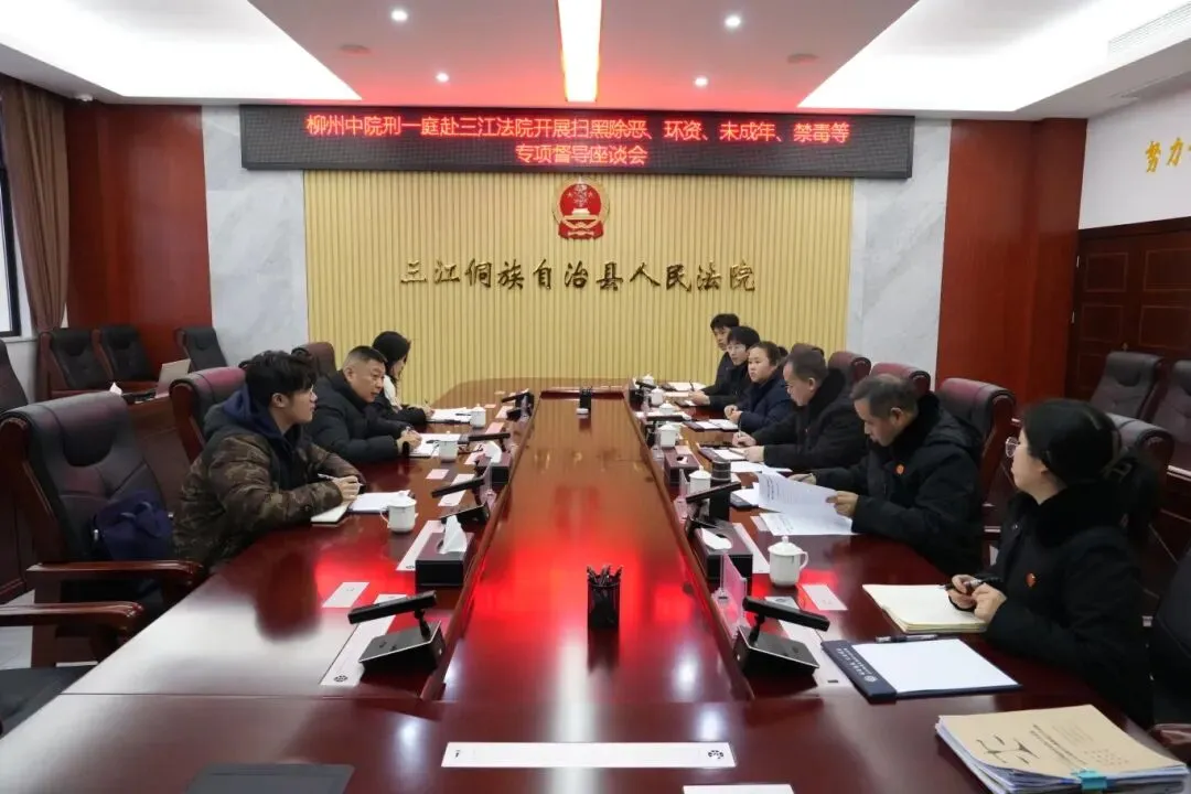 1月6日,柳州市中级人民法院刑事审判第一庭庭长陈龙一行到三江法院就刑事审判条线相关专项工作开展督导座谈。三江法院党组成员、副院长赖民书,刑事审判庭庭长、员额法官及法官助理参加会议。