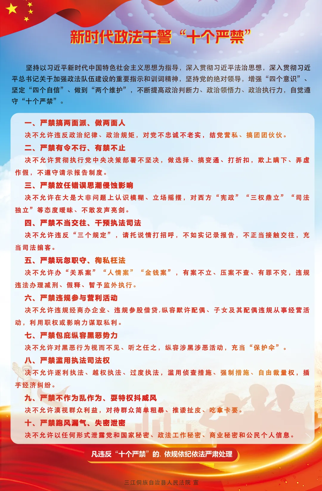 三是严守廉洁底线,锻造过硬队伍。要时刻绷紧廉洁自律这根弦,巩固深化教育整顿成果,常态化开展警示教育。要恪守职业道德,遵守司法礼仪,自觉抵制各种诱惑和干扰,确保清正廉洁。要严格落实防止干预司法“三个规定”等铁规禁令,以零容忍态度严惩司法腐败,着力锻造一支忠诚干净担当的刑事审判铁军。