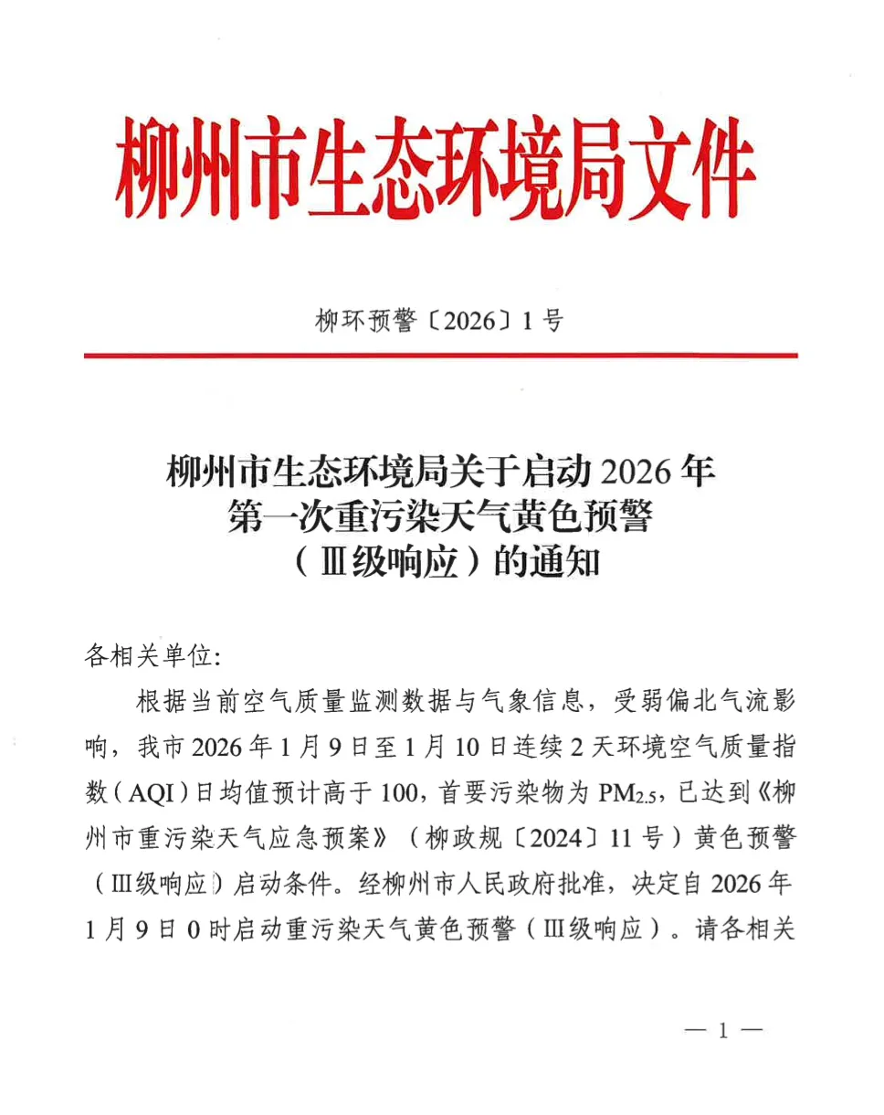 >柳州市生态环境局关于启动 2026年第一次重污染天气黄色预警(Ⅲ级响应)的通知