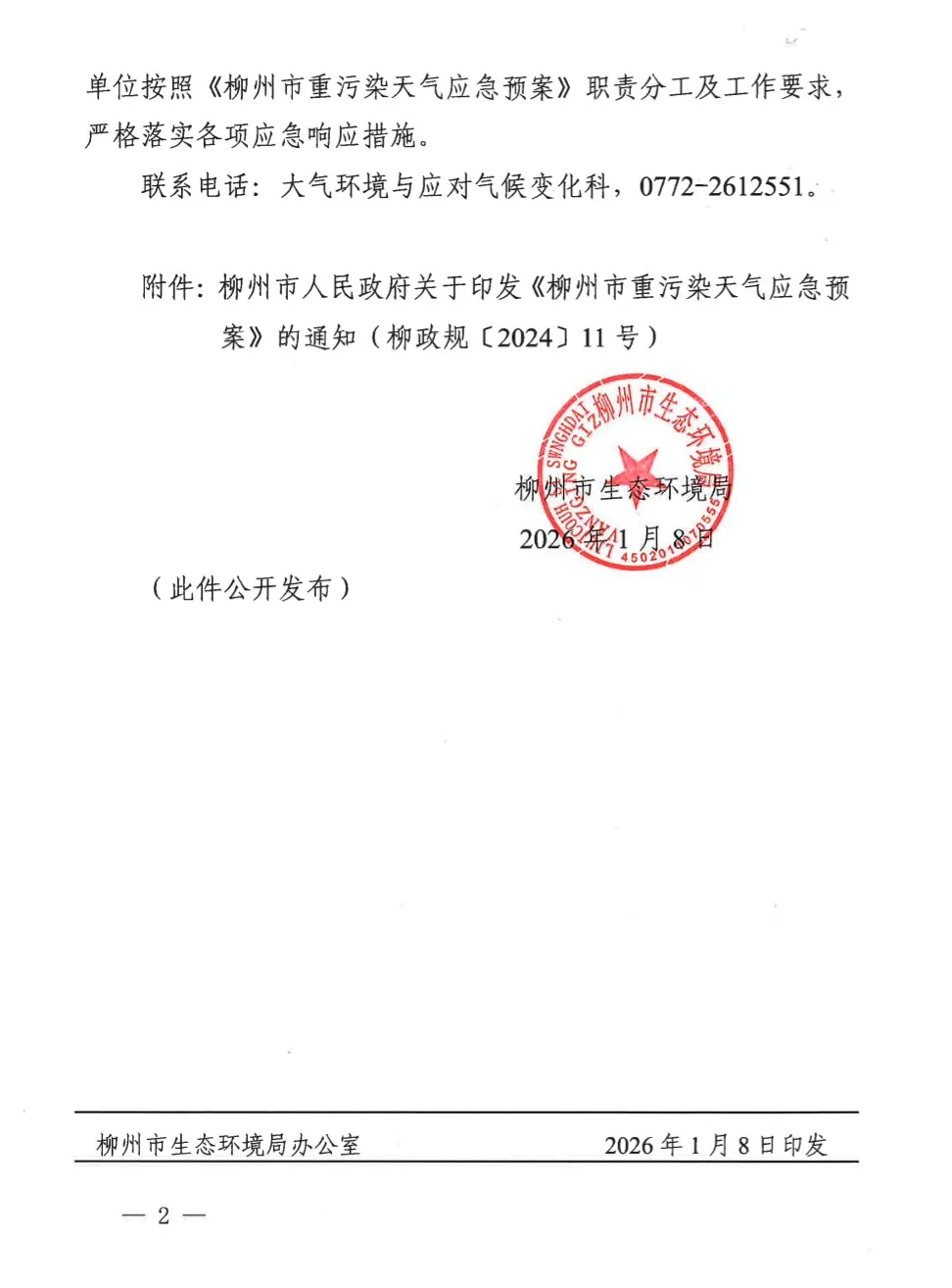 柳州市生态环境局关于启动 2026年第一次重污染天气黄色预警(Ⅲ级响应)的通知