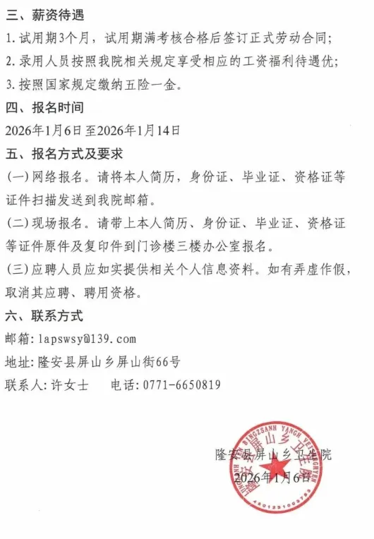 用人单位:隆安县屏山乡卫生院