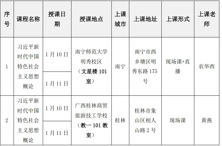 1.经前期学员人数统计,达到现场课开课人数的城市为南宁、桂林两市,其他城市学员若参加现场课的可自行选择到两市中任意一市授课点听课,或者选择直播课。
