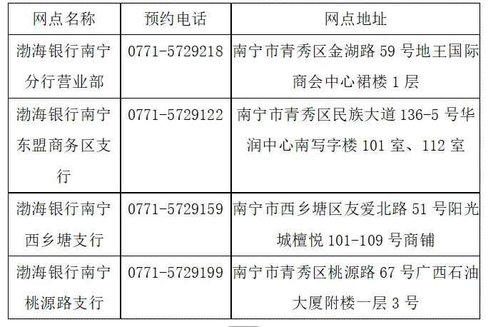 渤海银行南宁分行全辖网点地址