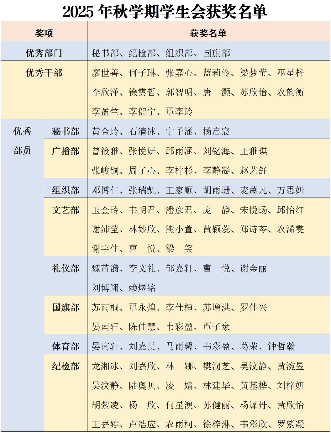 一份耕耘一份收获,本学期学生会涌现出大批表现突出的优秀干部与部员。会上,主席团代表何子琳宣读获奖名单及部门。团委副书记李雪霞和覃小莲、团委老师张倚源、各部门部长分别为优秀部门、优秀干部、优秀部员颁奖,现场掌声雷动,气氛热烈。