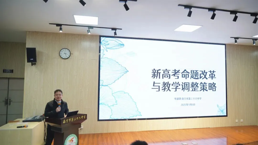 接着,岑盛锋校长以《新高考改革和教学调整策略》为题作专题发言。他指出,新高考命题更注重理解深度、思维灵活与综合运用能力,教学需跳出传统“知识点+题型”训练模式,转向系统思维培养。他强调,教师应深入理解新课标核心素养培养要求,课堂上引导学生开展项目式、探究式学习,推动课堂从“知识传授”向“素养培育”转型,真正实现教学与高考改革同频共振。岑盛锋校长的发言深刻剖析了新高考背景下的教学挑战,为全体教师紧跟高考改革方向调整课堂教学提供了清晰可行的路径指引。