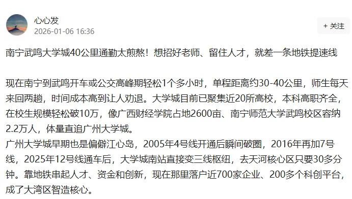 南宁武鸣大学城40公里通勤太煎熬!想招好老师、留住人才,就差一条地铁提速线