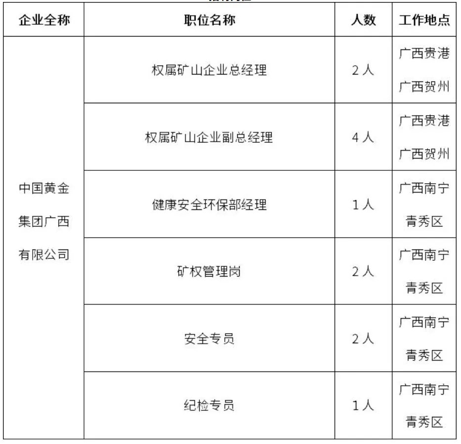 根据发展规划与高质量发展需要,中国黄金集团广西有限公司发布招聘公告,面向社会招聘一批业务骨干人员,公告如下。