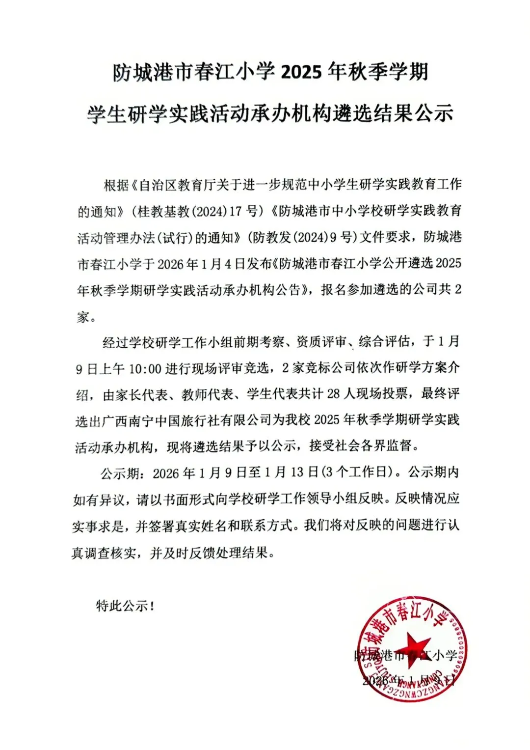 防城港市春江小学2025年秋季学期学生研学实践活动承办机构遴选结果公示