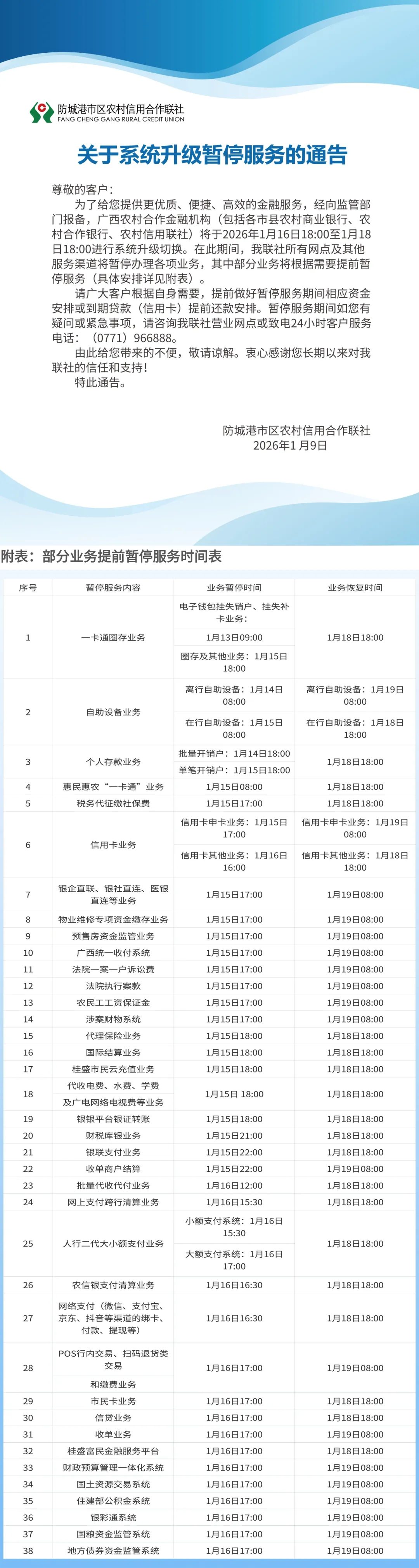 >防城港市区农村信用合作联社关于系统升级暂停服务的通告