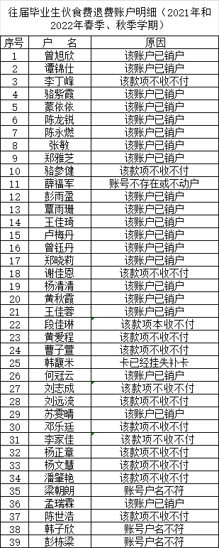 为贯彻落实上级文件精神,进一步规范膳食经费管理,切实保障学生合法权益,学校开展毕业生伙食费余额清退工作(注:2021年春季、秋季学期和2022年春季、秋季学期内宿生),经过第一次清退之后有66名同学显示转账失败,请以下同学(详见名单)将本人所持农村信用社银行卡号复印件及身份证复印件放到公车中学门卫室,办理时间自本公告之日起30天内。联系人黄老师:18778803431,杜老师:13877023681。