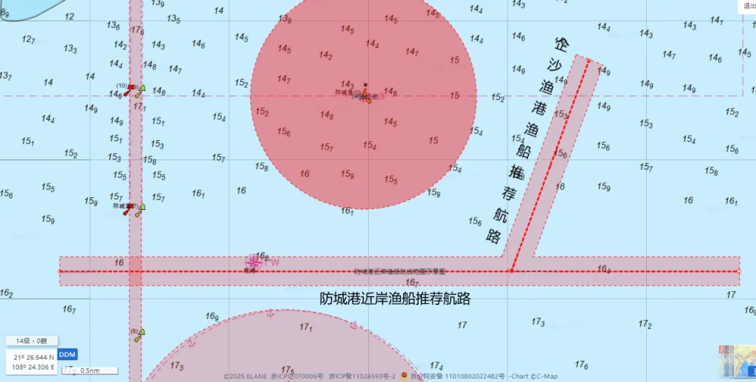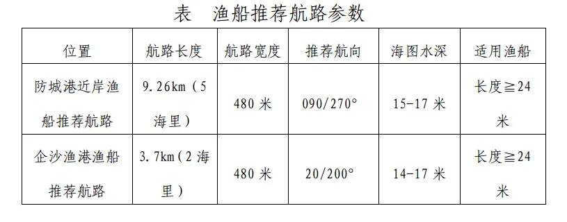 2.由企沙渔港前往防城港外海水域西侧或由防城港外海水域西侧返回企沙渔港的渔船,推荐使用企沙渔港渔船推荐航路。