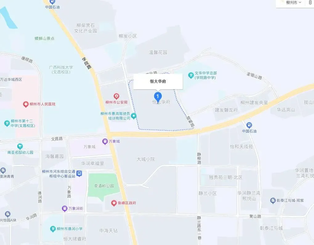 此次拍卖的别墅所在小区恒大华府,在柳州市,地段还是非常不错的,位于桂柳路北侧,学院路东侧,小区西边距离广西科技大学、柳州市人民医院和万象城都是非常近。小区附近学校有文华中学总部(学院路中学)、柳州市民族实验小学、柳州市公园路幼儿园总部。