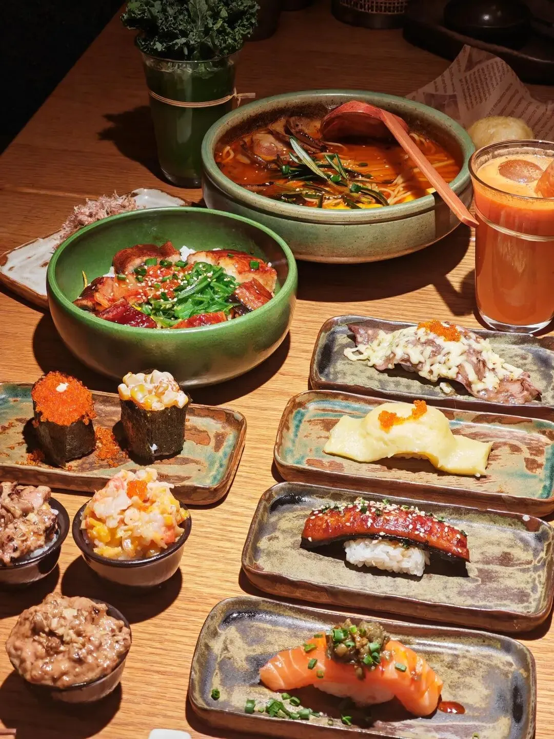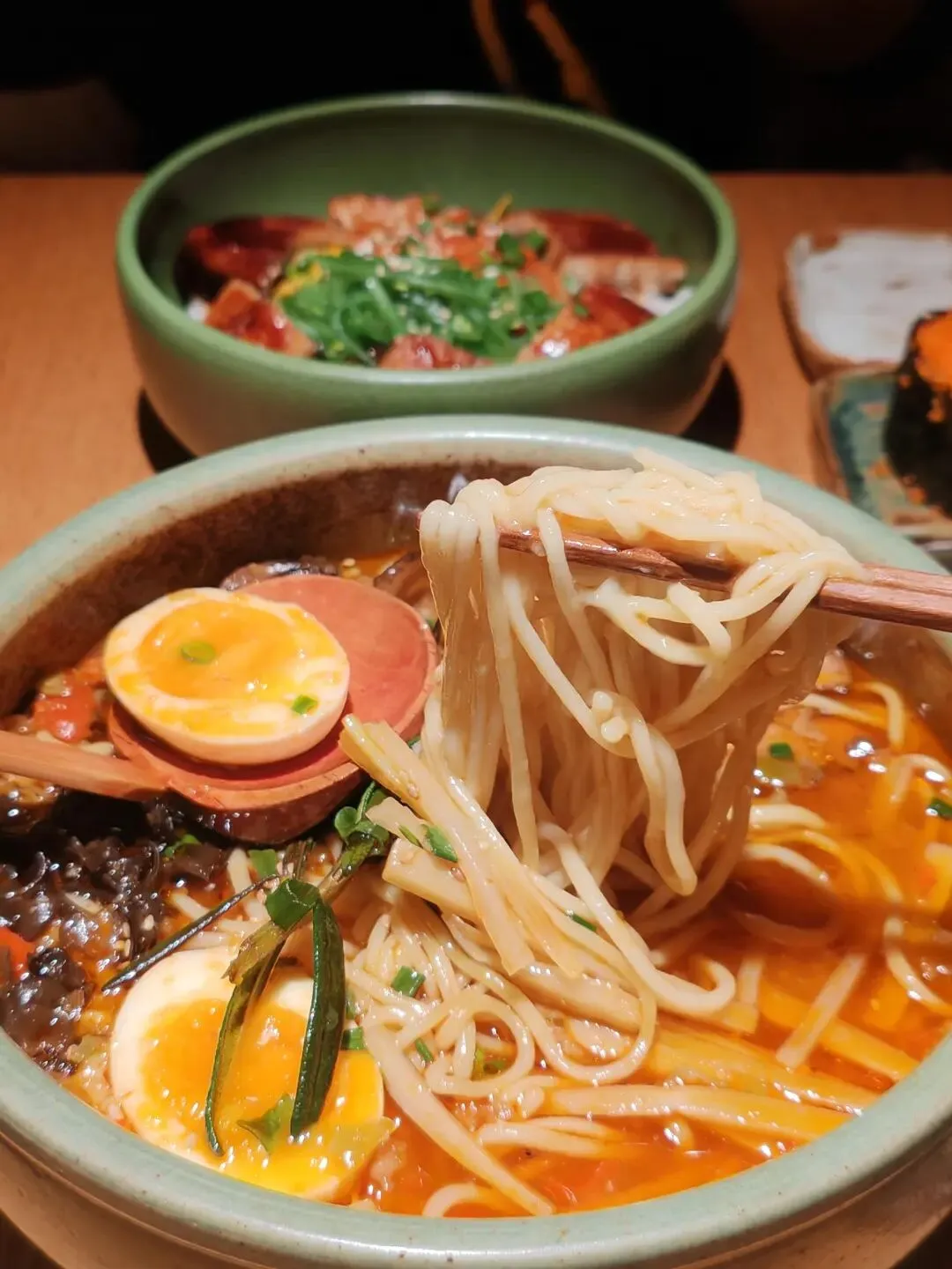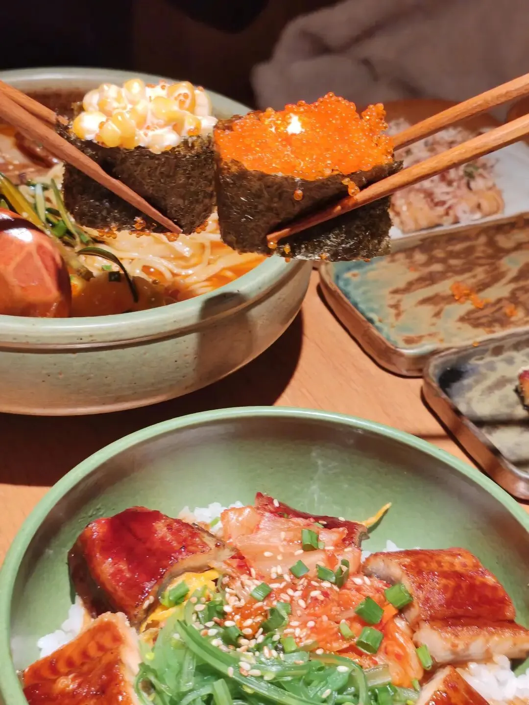 闭眼点全不踩雷的菜单,每款都值得N刷!必点的销魂拉面藏着灵魂汤底,用猪骨慢熬8小时而成,浓郁醇厚却不油腻,劲道的拉面吸饱汤汁,配上肥瘦相间的叉烧和溏心流心的温泉蛋,一口下去暖到心坎里。巴掌大的鳗鱼寿司绝对是重头戏,厚切的鳗鱼带着炭火香气,薄刷的鳗鱼酱经过炙烤形成焦糖化光泽,甜咸交织还带着鳗鱼骨熬制的深邃鲜味,裹着松软的醋饭,一口塞满嘴超满足。