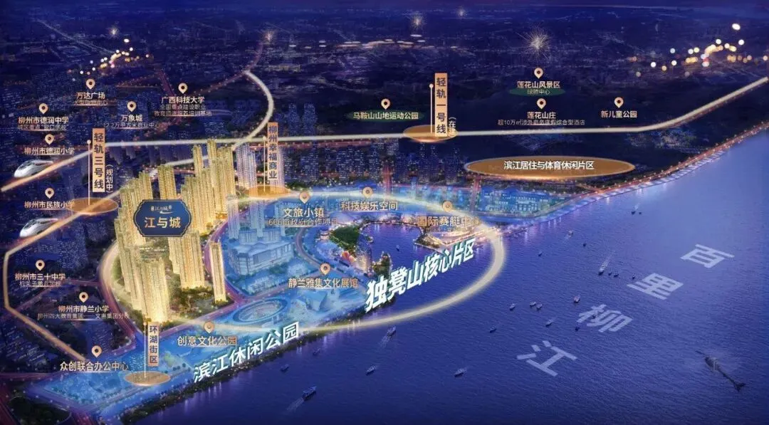 彰泰江与城位于河东独凳山片核心区,西面即是万象商圈,北面是莲花山风景区,东面坐拥5公里江岸线,南面连接鱼峰老城区,既是新老城区的交界点,也是未来5年内的城市新中轴区域。