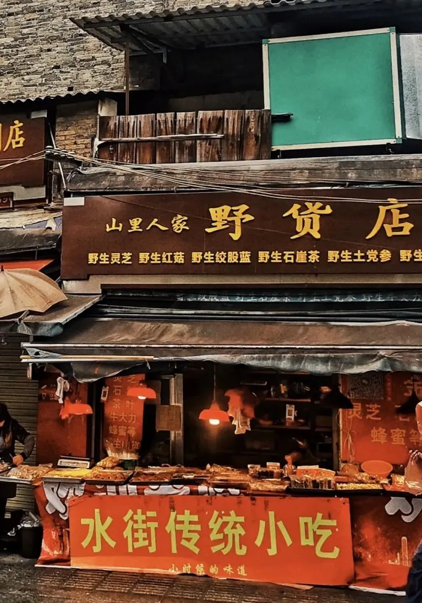 第八站,山里人家野货店了解一下!这家店在水街的小巷里,门头破破烂烂的,一看就很有特色。