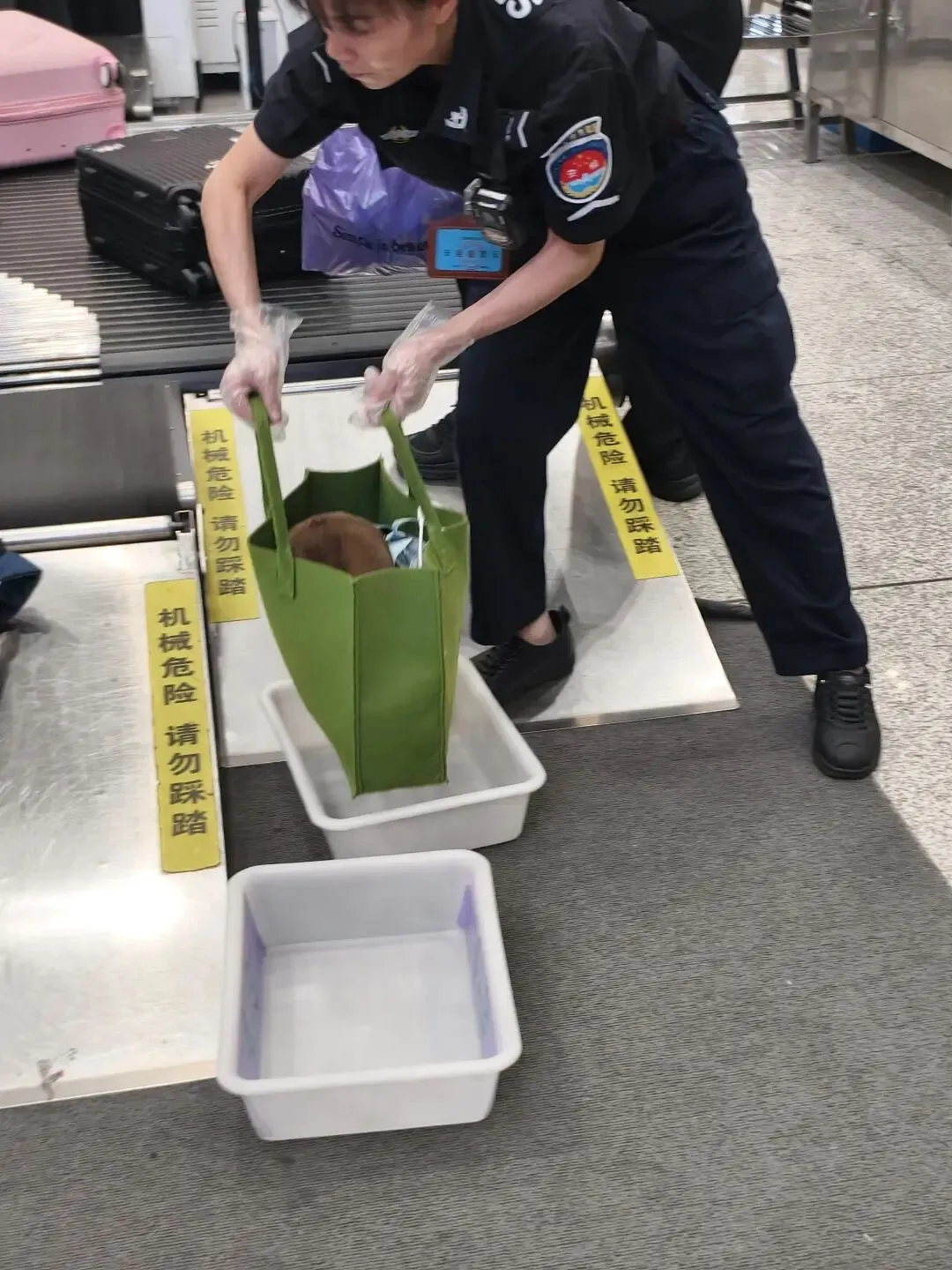 工作人员会把行李箱扶起来放到一边。 小件物品装在小盒子里,让你不用一边捞一边怕掉。