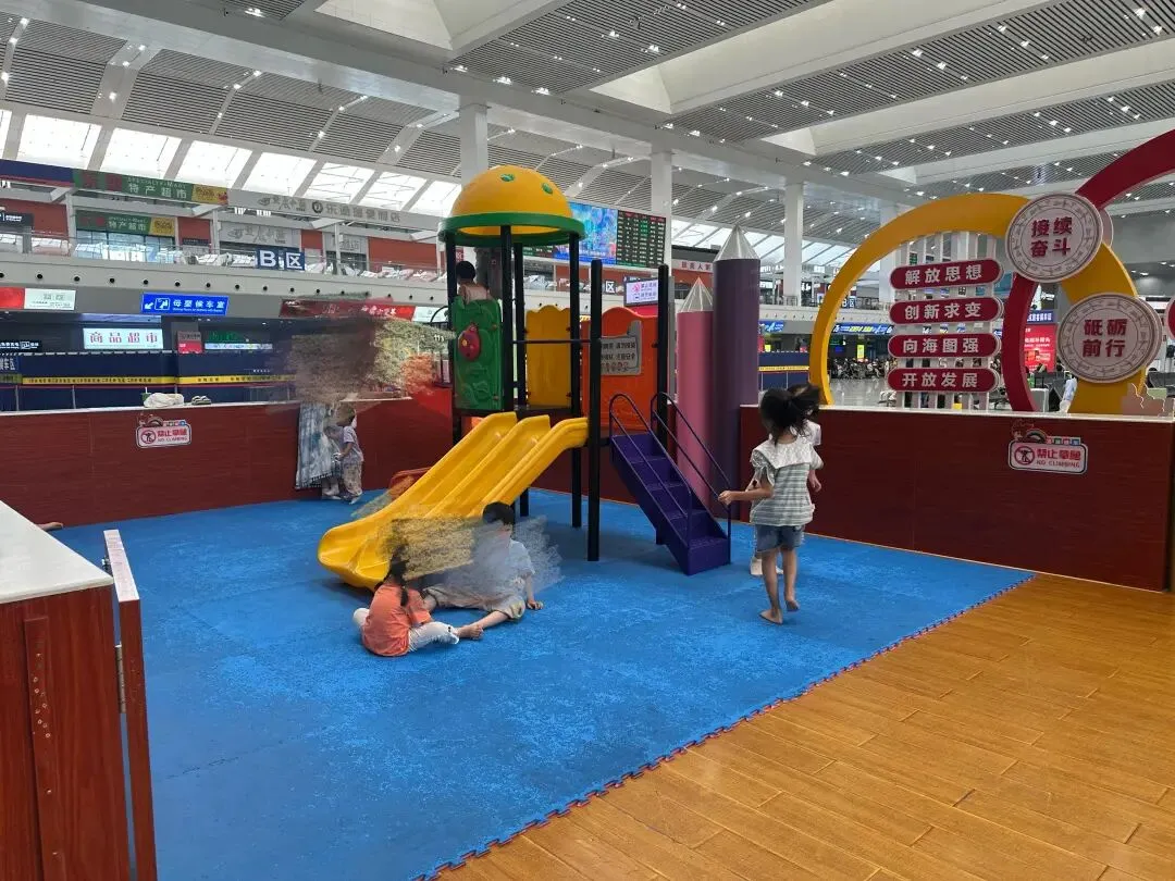 更绝的是候车区。 二楼候车区居然有个免费的儿童小乐园。 小滑梯下面有软垫。 旁边还能免费充电。