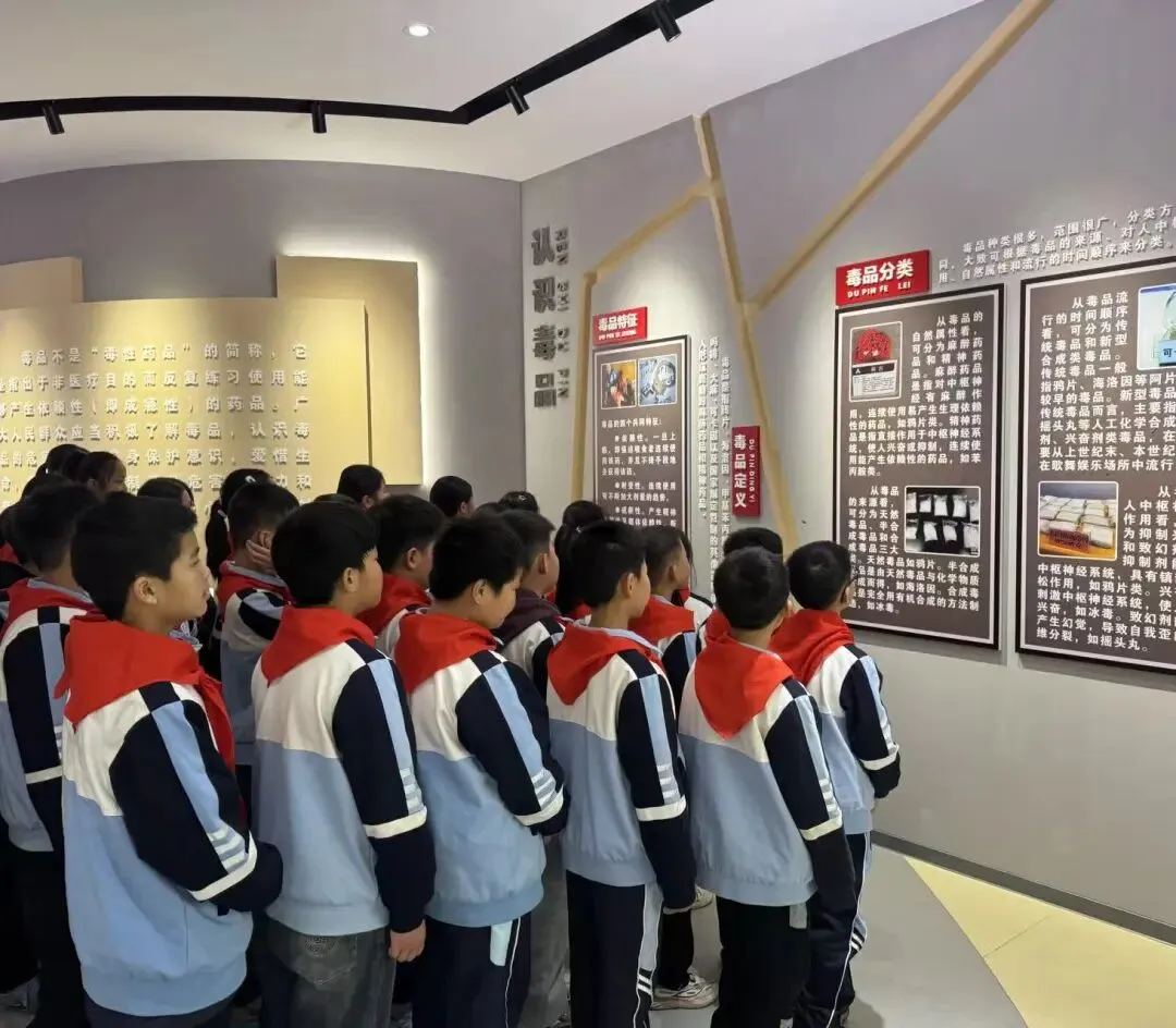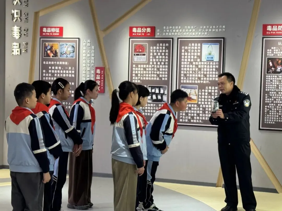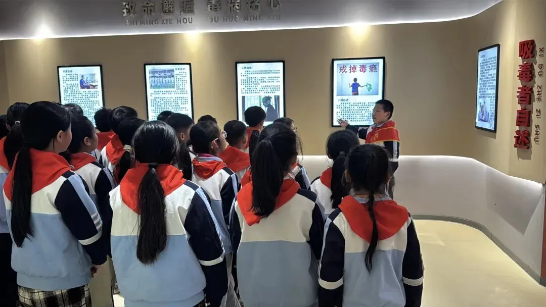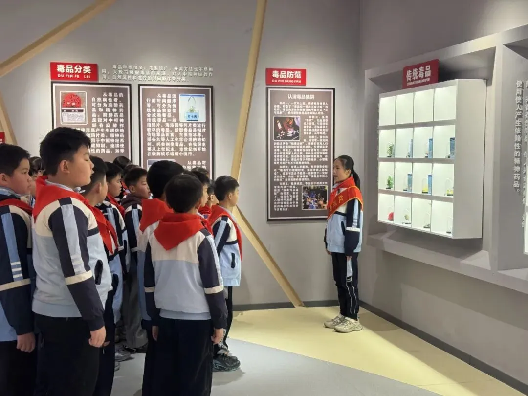 红领巾讲解员通过“毒情形势区”“识毒拒毒核心区”“VR体验区”等主题展厅,结合图文展板、仿真毒品模型、吸毒器具实物及真实案例,向队员们系统讲解了毒品的定义、种类、危害及当前禁毒形势。