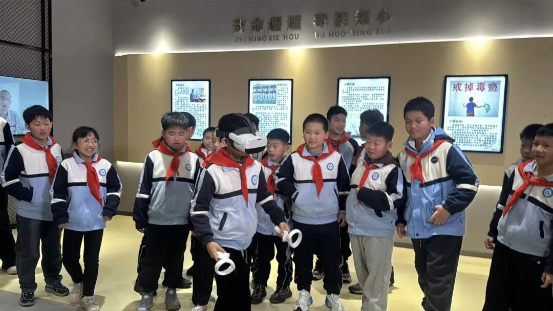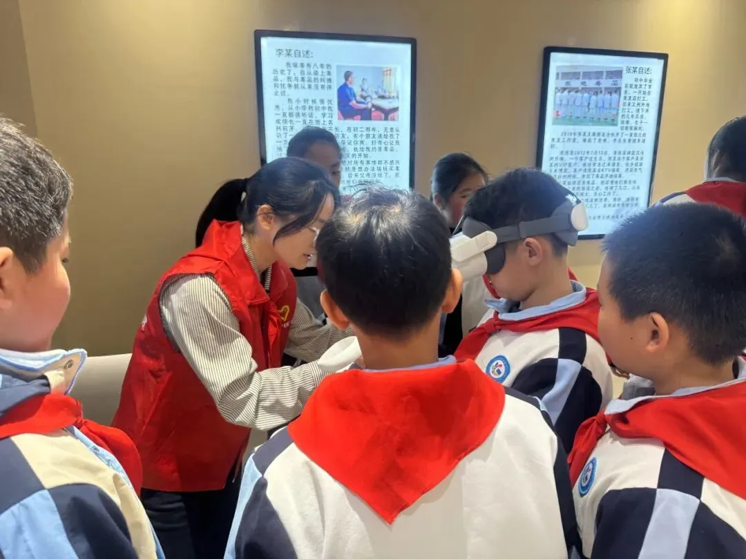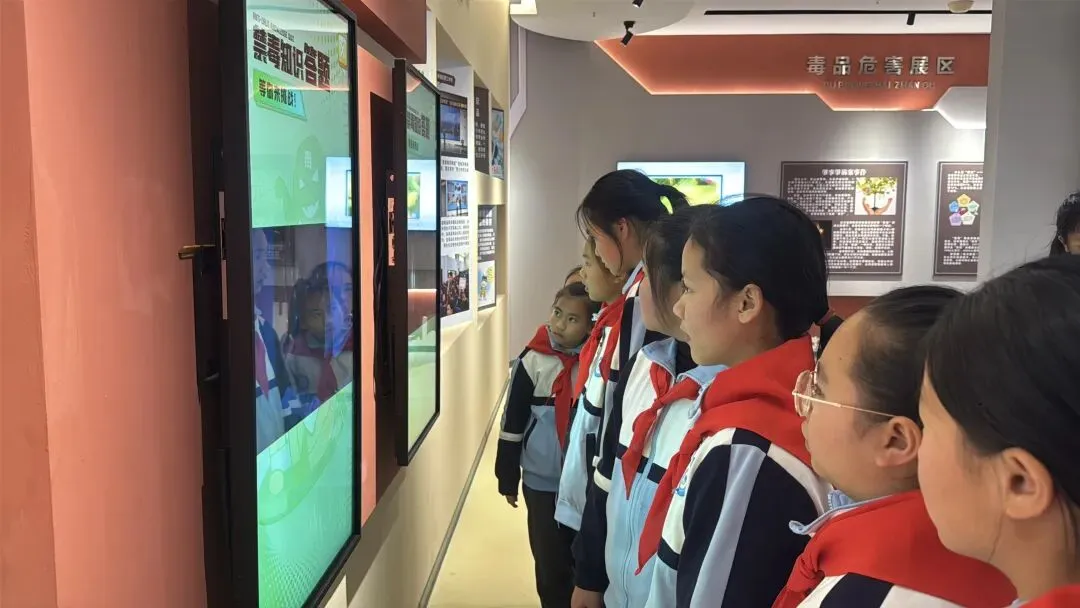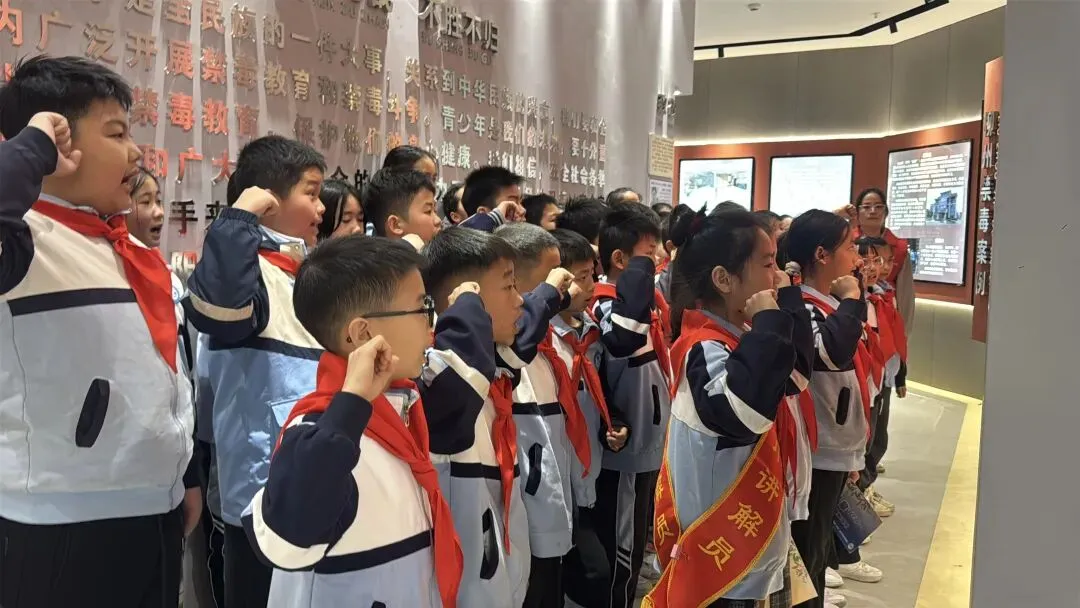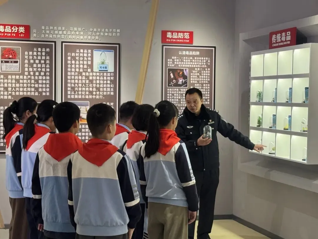 红领巾讲解员通过“毒情形势区”“识毒拒毒核心区”“VR体验区”等主题展厅,结合图文展板、仿真毒品模型、吸毒器具实物及真实案例,向队员们系统讲解了毒品的定义、种类、危害及当前禁毒形势。