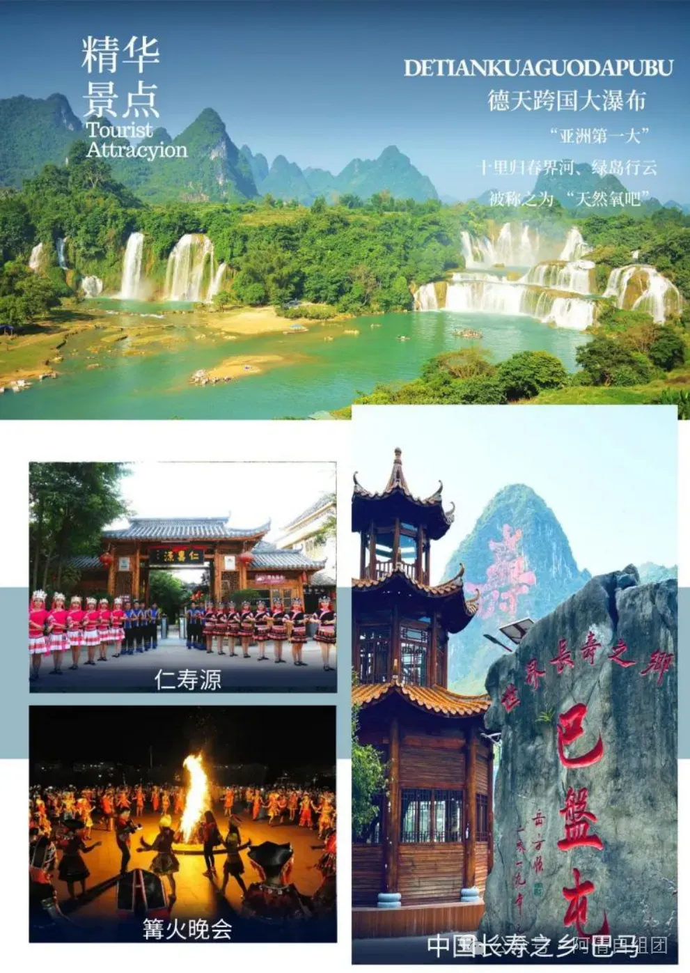 随后游览【仁寿源】景区,仁寿源景区是清光绪皇帝钦命广西提督学院赠送“惟仁者寿”寿匾给寿民邓诚才老人的故居,是巴马长寿文化的发源地,是巴马唯一人文景区。景区占地五十亩,出故居三进院外,园内设有特色食品作坊、游乐场、养生餐馆、民俗歌舞表演等休闲娱乐设施。是集巴马长寿文化、养生文化、孝道文化、饮食文化于一体的旅游度假景区。结合巴马长寿现象背景下的长寿人文资料,打造成地方特色浓厚的长寿文化旅游产品,为到巴马的游客提供一个了解巴马长寿历史、感知长寿文化、体验长寿氛围、探寻长寿奥秘、参与祈寿民俗表演的一个平台; 您到这不仅可以了解到巴马千年长寿文化的真谛,了解当地长寿老人的生活起居;还可以与这里的村民一起制作地道的长寿养生特色小吃,如糯米饼、豆腐花、糍粑等长寿小吃。品尝地道的的巴马养生菜肴“长桌宴”,无论您孤身一人或结伴亲朋好友来到这里都可亲身体验“长桌宴”的气氛,感受到瑶家的深厚魅力。