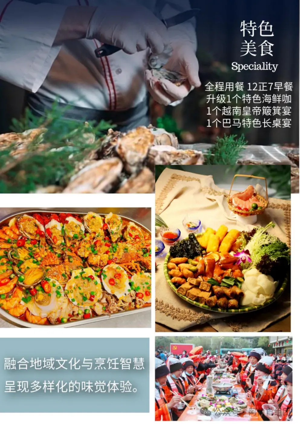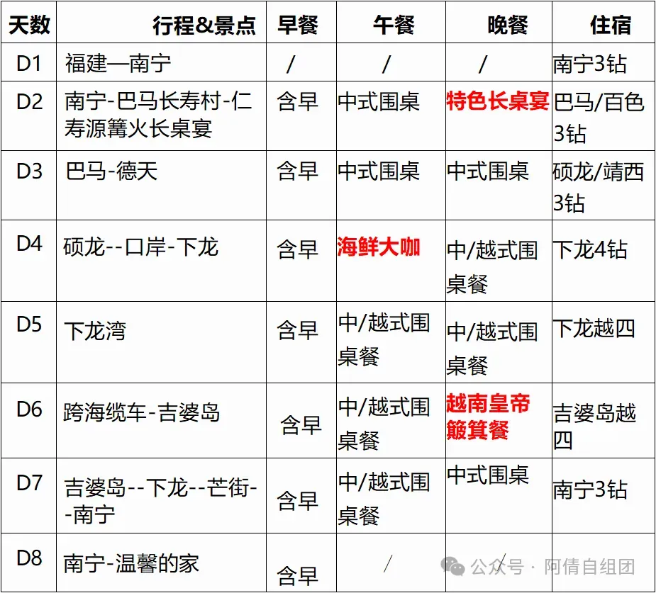 3.用餐:全程用餐 7 个早餐 12个正餐,正餐餐标:30元/人/餐,其中1个特色长桌宴、1个海鲜大咖,1个越南皇帝簸箕餐。
