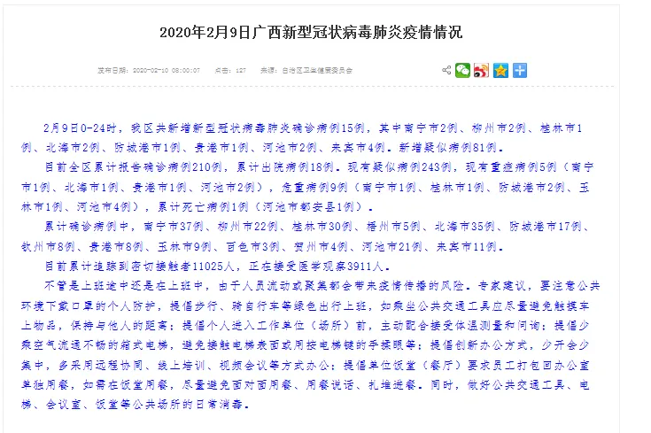 目前全区累计报告确诊病例210例,累计出院病例18例。现有疑似病例243例,现有重症病例5例(南宁市1例、北海市1例、贵港市1例、河池市2例),危重病例9例(南宁市1例、桂林市1例、防城港市2例、玉林市1例、河池市4例),累计死亡病例1例(河池市都安县1例)。