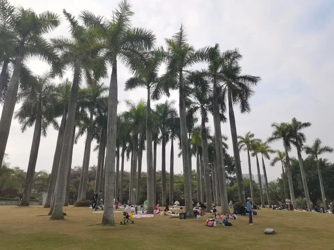 只见前方几十颗十几米高的棕榈树,一字排开撑开一大片绿意,草地间满是生活的烟火气。