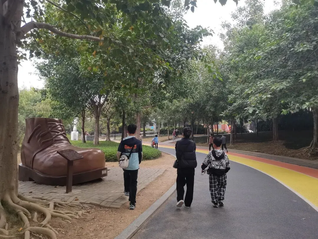 喂完鱼继续往前,两只巨型皮鞋雕塑格外吸人眼球,棕色的鞋身质感厚重。