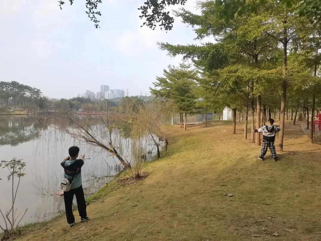 下车,拿上三把弹弓加上几包鱼食,一家四口的快乐,开始了。