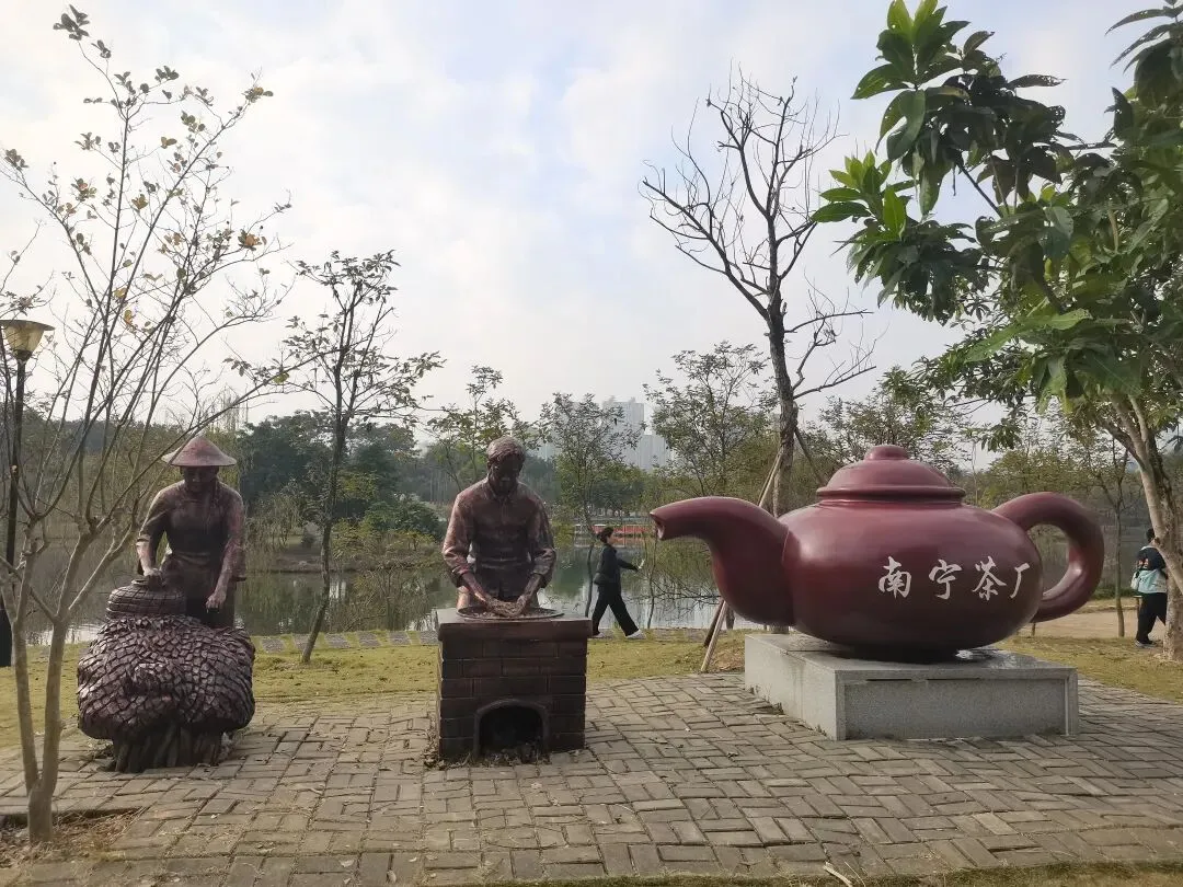 “南宁茶厂”的壶身衬着湖畔绿意,三个雕塑上记录了茶的过程,采茶、制茶、泡茶满是地域特色,很有感觉,拍的时候康总刚好经过,凑成一幅和谐的喝茶图。