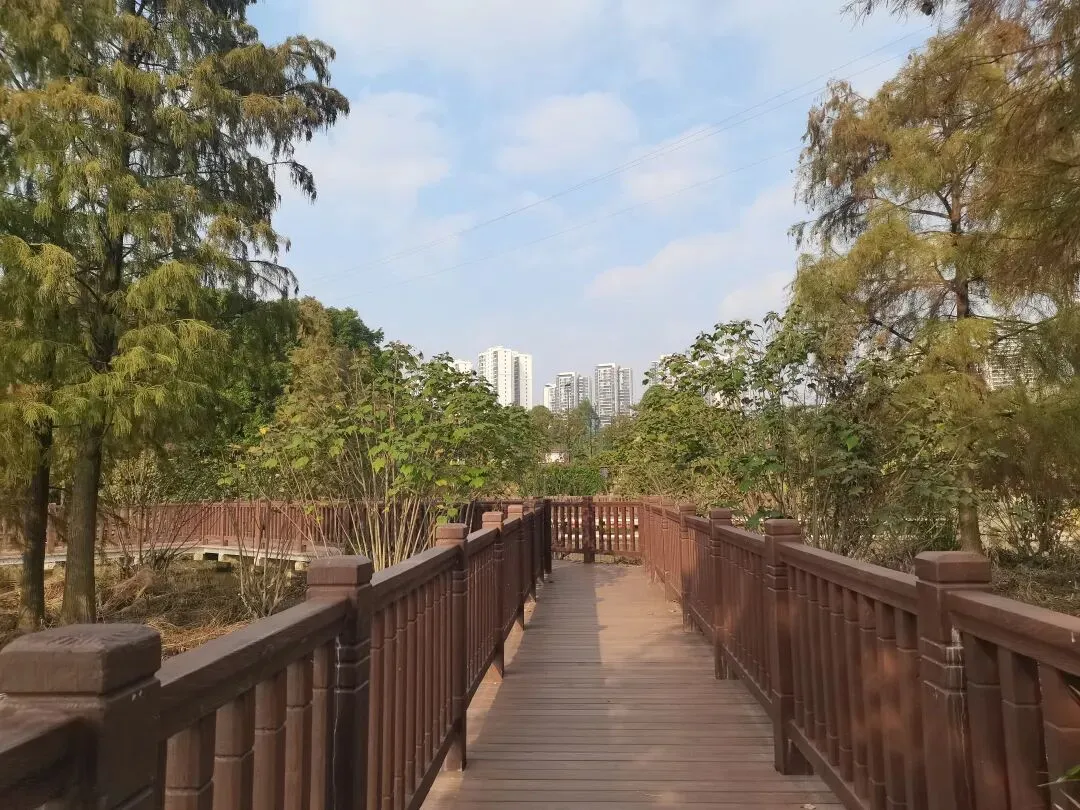 我们沿着木质栈道穿梭在水杉林间,枝叶掩映下,步道延伸到对岸,静谧又治愈,让人心情平静。