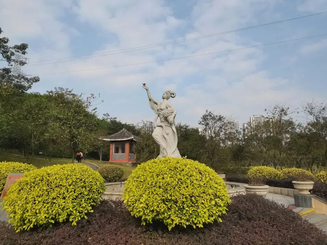 洁白的仙女雕像与黄绿相间的灌木丛相映,为公园添了几分雅致的美感,舒服。